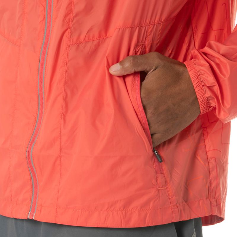 Jaqueta feita em crepe de poliamida, com as barras das mangas e do corpo com elástico, possui capuz com ajuste e recorte nas costas com função de ventilação. Os bolsos frontais são com zíper. Cava raglan. Logo refletivo.